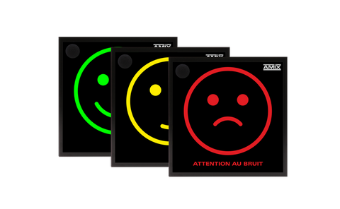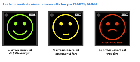 L'AMI24 affiche des seuils de niveaux sonores au moyen de trois pictogrammes très représentatifs sous la forme stylisée d'un visage souriant, grimaçant ou très triste, qui changent de couleur en fonction de l'intensité du bruit. Une phrase “Attention au bruit”, s’allume en rouge si le niveau sonore dépasse le deuxième seuil défini.