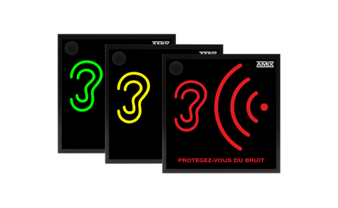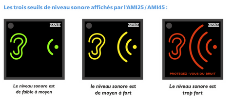 L'AMI45 affiche des seuils de niveaux sonores au moyen de trois pictogrammes très représentatifs sous la forme stylisée d'un visage souriant, grimaçant ou très triste, qui changent de couleur en fonction de l'intensité du bruit. Une phrase “Attention au bruit”, s’allume en rouge si le niveau sonore dépasse le deuxième seuil défini.