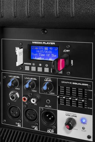 Une enceinte active double 15" avec récepteur BT, lecteur MP3, grave médium puissant et pavillon dynamique à compression, pour une excellente reproduction sonore. Larges possibilités d'installation grâce à la technologie BT. Le lecteur MP3 lit des fichiers audio via une clé USB ou carte SD. La sortie Slave permet de brancher d'autres enceintes. Caisse en ABS moulée solide, de faible poids, grille métallique robuste en façade protégeant les haut-parleurs. Cette double enceinte active peut être utilisée seule et est parfaite pour des applications dans des bars, restaurants, petits théâtres, salles de fitness, centres de conférences et sur scènes.