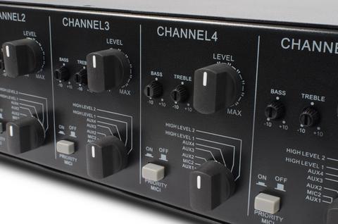Cet amplificateur PA 5 canaux permet d'envoyer de la musique ou des annonces vers 5 différentes zones choisies. L'amplificateur matriciel dispose de 4 entrées Aux et de 2 entrées niveau élevé, de deux connexions micro, Micro 1 est prioritaire. Avec le sélecteur de zones, chaque entrée peut être attribuée à une des 5 zones. Le volume de chaque zone peut être réglé de manière centrale. Le système est conçu pour des applications d'annonces, paging, interphones, musique d'ambiance, transmission dans des locaux industriels..